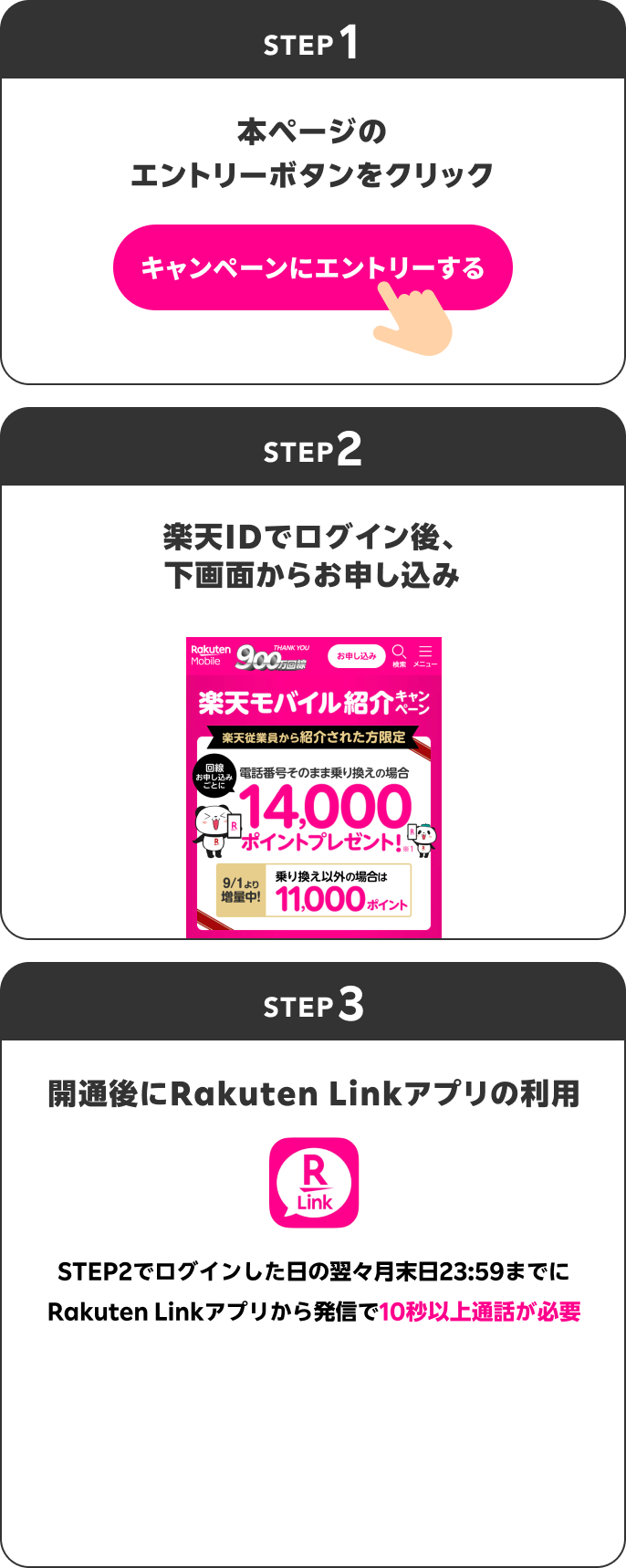 ※【楽天モバイル】Rakuten最強プラン紹介キャンペーン(キャンペーンコード:1784)とは異なり、「Rakuten Link」を10秒間以上通話を行わなくても特典付与対象になります