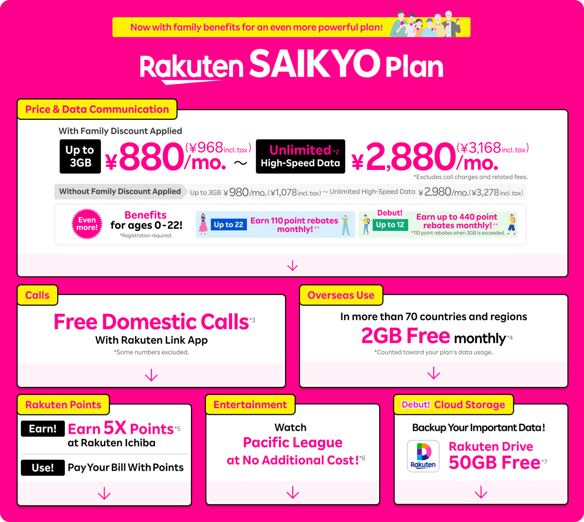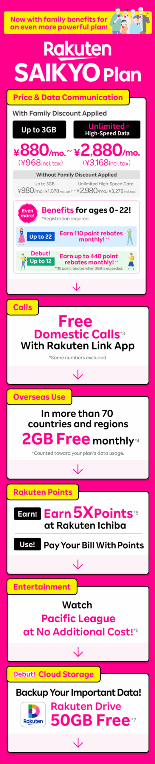 Rakuten SAIKYO Plan offers many advantages! Just ¥880 (¥968 incl. tax) per month for up to 3GB with family discount - ¥2,880 (¥3,168 incl. tax) per month for unlimited data speed. In addition, if you are under 22 years old, you can earn 110 points monthly with Rakuten SAIKYO YOUTH program! Kids 12 and under can get up to 440 points back every month with Rakuten SAIKYO KIDS program!